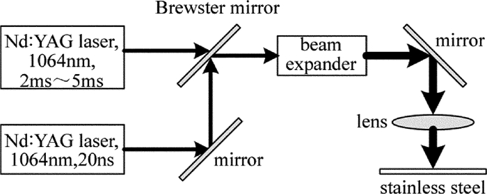 復合激光脈沖打孔實驗裝置如圖 1所示。兩束激光波長均為1064nm,毫秒激光脈寬2ms~5ms可調,頻率為30Hz,單脈沖能量為2J~5J,聚焦光斑為300μm,納秒激光脈寬為20ns,頻率為10kHz,單脈沖能量為1.5mJ,聚焦光斑為100μm。兩束激光通過布儒斯特片非相干合束,經過擴束準直,聚焦于厚度為5mmSUS 304不銹鋼表面。