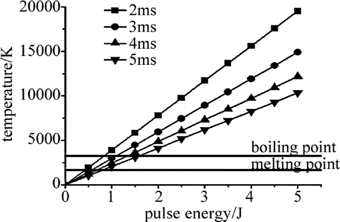 (1)式得到不同脈寬下毫秒激光單脈沖能量與不銹鋼材料表面溫升的關系曲線,如圖 6所示。根據計算可知,使不銹鋼表面達到熔點所需的激光能量約為其達到沸點的一半。以脈寬為5ms的長脈沖為例,使不銹鋼表面達到熔點的單脈沖能量為0.82J,達到沸點的單脈沖能量為1.58J。當脈沖能量相同時,脈寬越窄,峰值功率密度越大,材料的表面溫升越高。納秒脈沖的峰值功率密度遠大于毫秒脈沖,疊加后使材料表面溫度進一步升高。
